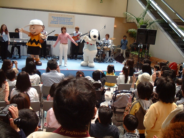 ステージに現れたスヌーピーとチャーリー・ブラウン。バンドのメンバーもスヌとお揃いの衣装。 |